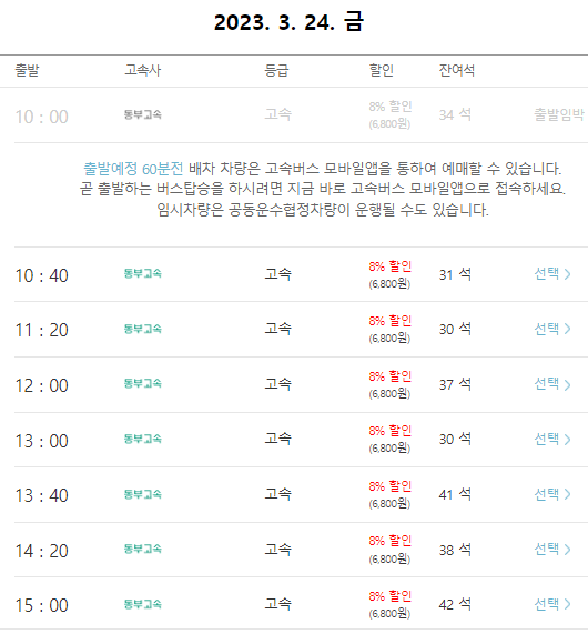 본인이 원하는 시간대의 서울경부행 고속버스를 선택합니다.