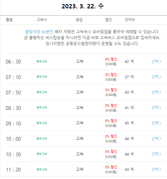 본인이 원하는 시간대의 서울경부행 고속버스를 선택합니다.