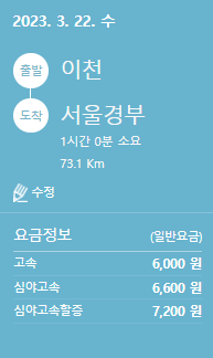 이천에서 서울경부 가는 고속버스 요금 및 소요시간(2023.03.22)입니다. 요금은 고속(6,000원), 심야우등(6,600원), 심야우등할증(7,200원)이며, 소요시간은 1시간 예상됩니다.
