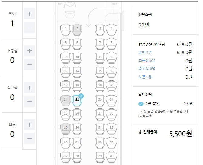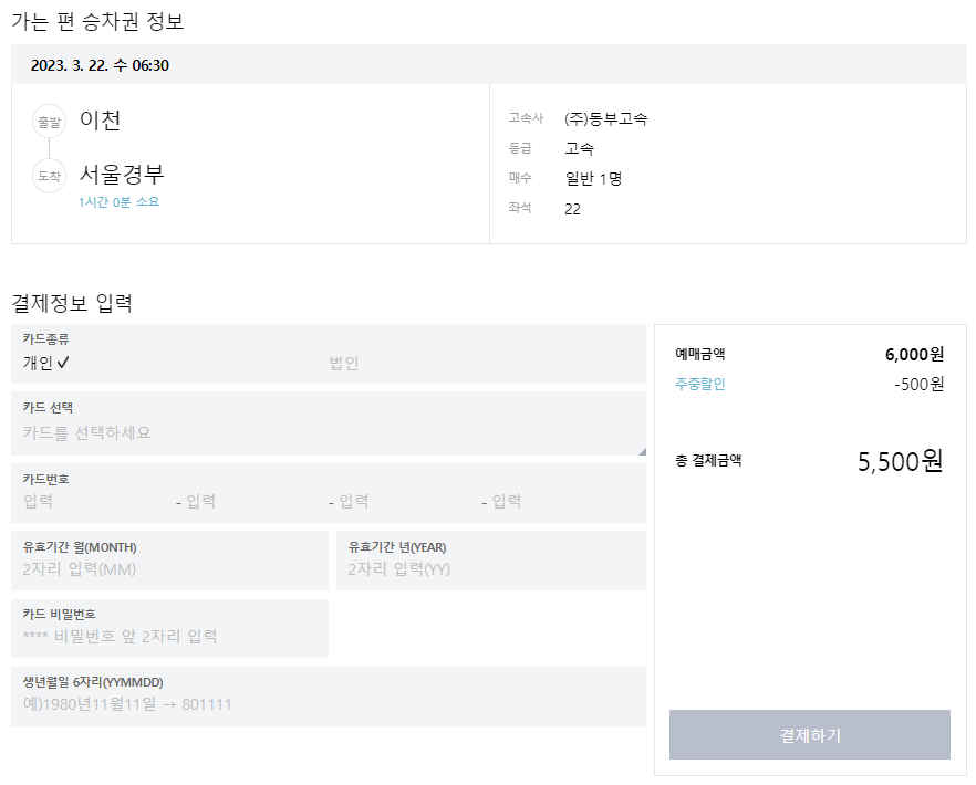 그러면 승차권 예매 정보를 확인할 수 있습니다. 카드정보를 입력하고 결제를 하면 예매가 완료됩니다.