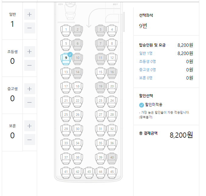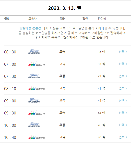 본인이 원하는 시간대의 대전복합행 고속버스를 선택합니다.