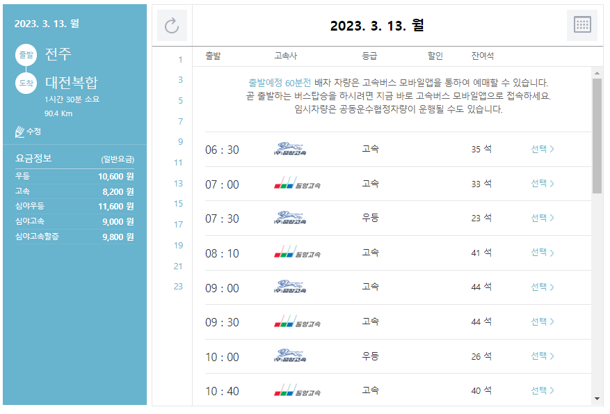 전주 고속버스터미널에서 대전 가는 2023.03.13. 시간표를 확인할 수 있습니다. 예매는 출발 전 10분까지 가능하며, 고속버스 통합예매(pc)과 코버스(모바일)를 통해 온라인 예매가 가능합니다. 자세한 내용은 고속버스 통합예매 방법에서 알아보겠습니다.