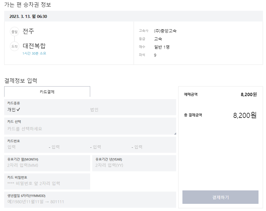 그러면 승차권 예매 정보를 확인할 수 있습니다. 카드정보를 입력하고 결제를 하면 예매가 완료됩니다.