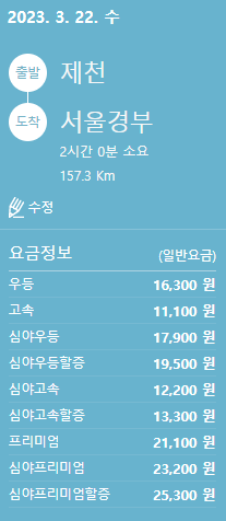 제천에서 서울경부로 가는 고속버스 요금 및 소요시간(2023.03.22)입니다. 요금은 우등(16,300원), 고속(11,100원), 심야우등(17,900원), 심야우등할증(19,500원), 심야고속(12,200원), 심야고속할증(13,300원), 프리미엄(21,100원), 심야프리미엄(23,200원), 심야프리미엄할증(25,300원)이며, 소요시간은 2시간 예상됩니다.