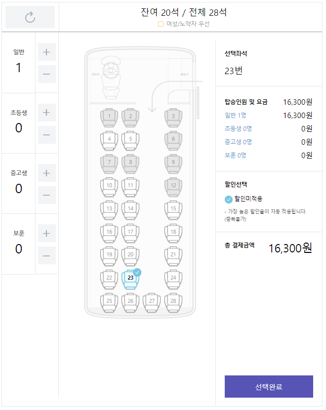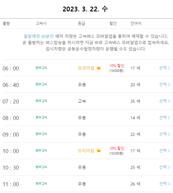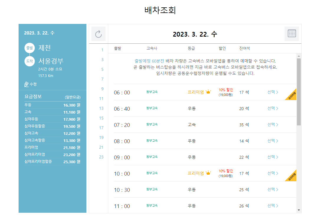 본인이 원하는 시간대의 서울경부행 고속버스를 선택합니다.