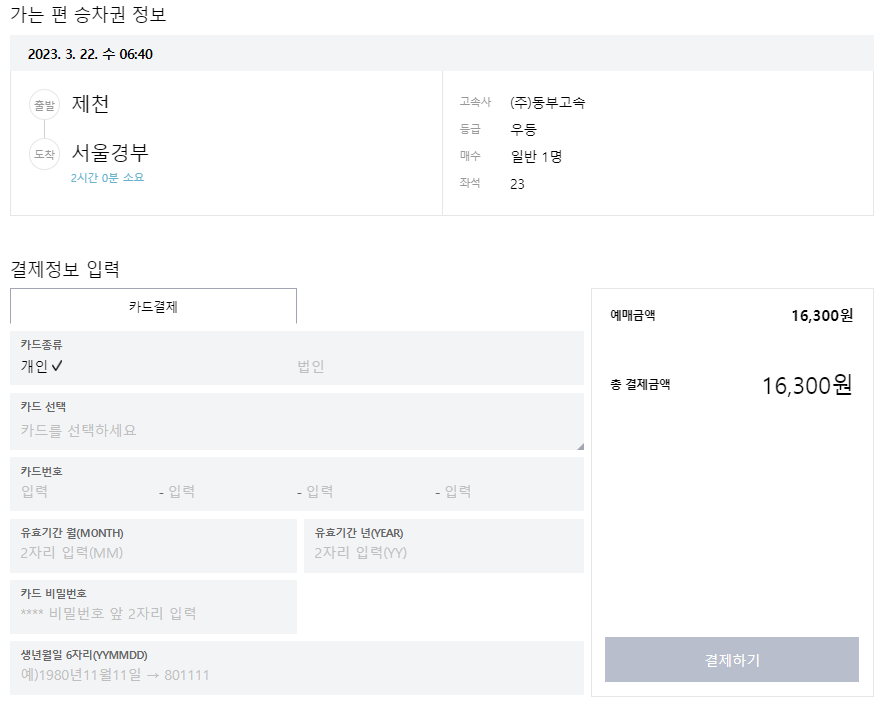 그러면 승차권 예매 정보를 확인할 수 있습니다. 카드정보를 입력하고 결제를 하면 예매가 완료됩니다.