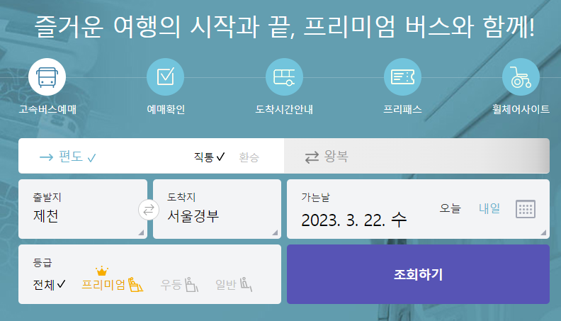제천 고속버스터미널 시간표를 확인하기 위해서 고속버스 통합예매 홈페이지을 접속하시면 가운데에 예매하는 메뉴가 있습니다. 편도인지 왕복인지를 체크를 합니다. 출발지를 제천으로 선택하고 도착지를 서울경부로 선택하였습니다. 가는날짜를 (2023.03.22) 선택하고 조회를 클릭합니다.
