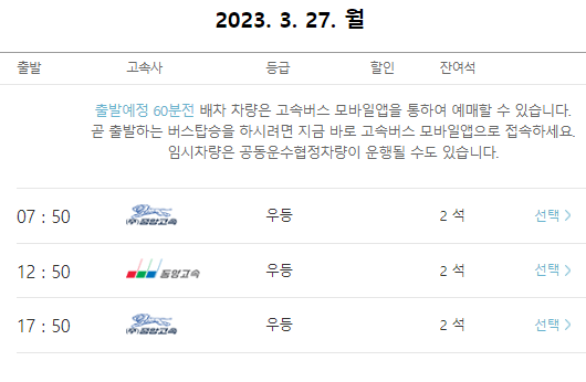 본인이 원하는 시간대의 서울경부행 고속버스를 선택합니다.