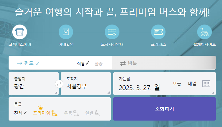 황간 고속버스터미널 시간표를 확인하기 위해서 고속버스 통합예매 홈페이지을 접속하시면 가운데에 예매하는 메뉴가 있습니다. 편도인지 왕복인지를 체크를 합니다. 출발지를 황간으로 선택하고 도착지를 서울경부로 선택하였습니다. 가는날짜를 (2023.03.27) 선택하고 조회를 클릭합니다.